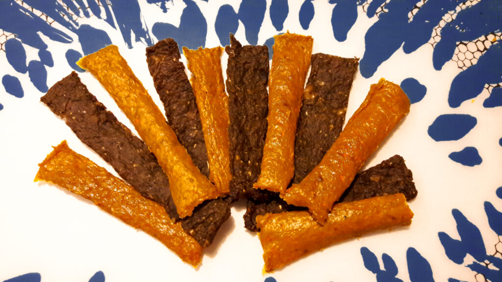 Option 1 : Sortez vos languettes du four, détachez-les délicatement une à une et placez les dans votre déshydrateur. Je mets à 65-70° et je laisse mes languettes sécher aussi longtemps que cela est nécessaire en allant vérifier régulièrement leur aspect et leur texture.