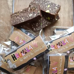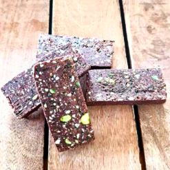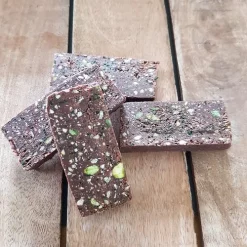 Ingrédients : pâte de dattes*, purée de noisettes*, noix*, pistaches*, raisins secs*, poudre de cacao*, spiruline** (3,6%), sel*