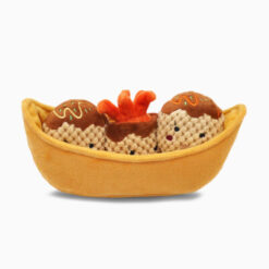 Deux takoyakis contiennent des “pouic-pouic” et le 3e contient une petite peluche en forme de poulpe. Vous pourrez cacher de la nourriture dans ce dernier pour que votre chien comprenne qu’il doit retirer le poulpe de la boulette pour réussir à obtenir la récompense.