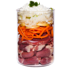 Cœur de poulet (38 %), gésier de poulet (19 %), carotte (14 %), pomme de terre (9 %), fenouil (8 %), céleri (4 %), cottage cheese (3 %), farine de noix de coco (1 %), coquille d’huître*, argile* (0,5 %), camomille* (0,5 %), mélisse officinale* (0,3 %), souci officinal* (0,3 %), sel des Andes (0,2 %), huile de cumin noir (0,2 %), algue marine*, substances minérales *séché