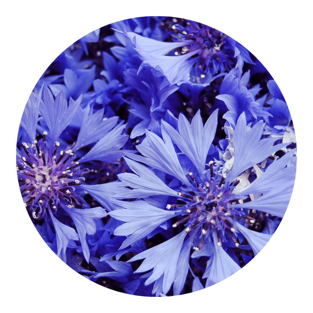 Le bleuet, aussi appelé Centaurea cyanus, est une plante aux tiges fines, aux feuilles gris-vert avec de belles fleurs le plus souvent bleu vif, plus rarement roses ou blanches, appartenant à la famille des Astéracées et originaire du Proche-Orient. Le bleuet a toujours été reconnu par la médecine populaire pour sa faculté à soigner les yeux. Il permettrait en effet de soigner les conjonctivites, les inflammations des paupières et des yeux fatigués et irrités. Dans l’agriculture, le bleuet est considéré comme une mauvaise herbe. En revanche, grâce à son pollen et à sa haute teneur en sucre, elle sert de fourrage pour les insectes et les oiseaux. De plus, le bleuet est utilisé pour lutter contre les insectes nuisibles notamment dans les champs de chou.