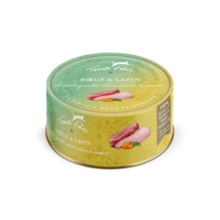 Avec 90 % de viande musculaire fraîche et des abats de qualité, les menus Terra Felis sans céréales ont une très haute teneur en viande. Le chat strictement carnivore ingurgite ainsi les acide gras oméga-3 et 6 importants pour lui et les protéines animales nécessaires pour la production d’énergie et tous les processus métaboliques. Pour le fonctionnement correct des intestins et du péristaltisme intestinal, le chat a besoin d’une faible quantité de fibres. Tous les menus Terra Felis sont donc complétés par une sorte de légume sélectionnée telle que l’herbe-aux-chat par exemple. De la taurine et de l’huile de colza riche en acides gras oméga-3 parfont en outre ces repas. Seuls des ingrédients répondant à 100 % aux standards de l’alimentation humaine sont utilisés. Cette qualité et cette fraîcheur se reflètent dans l’odeur extrêmement appétissante et fine des menus qui sont par conséquent très bien tolérés par les chats.
