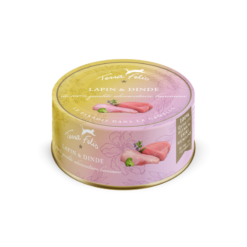 Avec 90 % de viande musculaire fraîche et des abats de qualité, les menus Terra Felis sans céréales ont une très haute teneur en viande. Le chat strictement carnivore ingurgite ainsi les acide gras oméga-6 importants pour lui et les protéines animales nécessaires pour la production d’énergie et tous les processus métaboliques. Pour le fonctionnement correct des intestins et du péristaltisme intestinal, le chat a besoin d’une faible quantité de fibres. Tous les menus Terra Felis sont donc complétés par une sorte de légume sélectionnée telle que l’herbe-aux-chat par exemple. De la taurine et de l’huile de colza riche en acides gras oméga-3 parfont en outre ces repas. Seuls des ingrédients répondant à 100 % aux standards de l’alimentation humaine sont utilisés. Cette qualité et cette fraîcheur se reflètent dans l’odeur extrêmement appétissante et fine des menus qui sont par conséquent très bien tolérés par les chats.